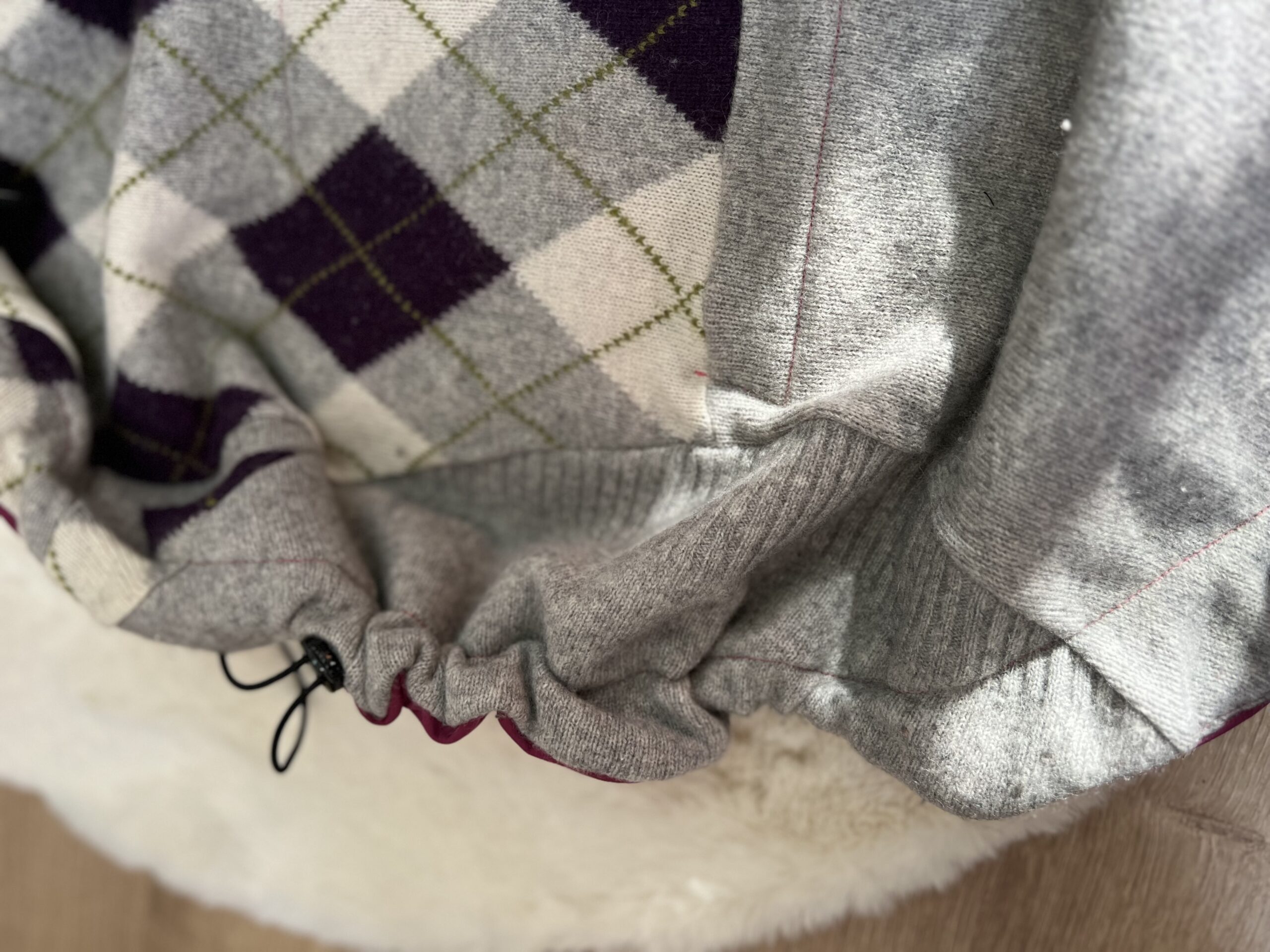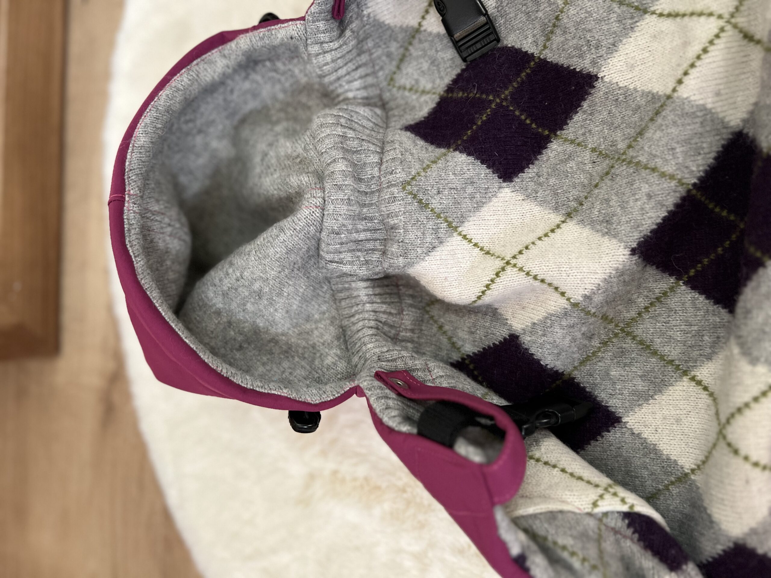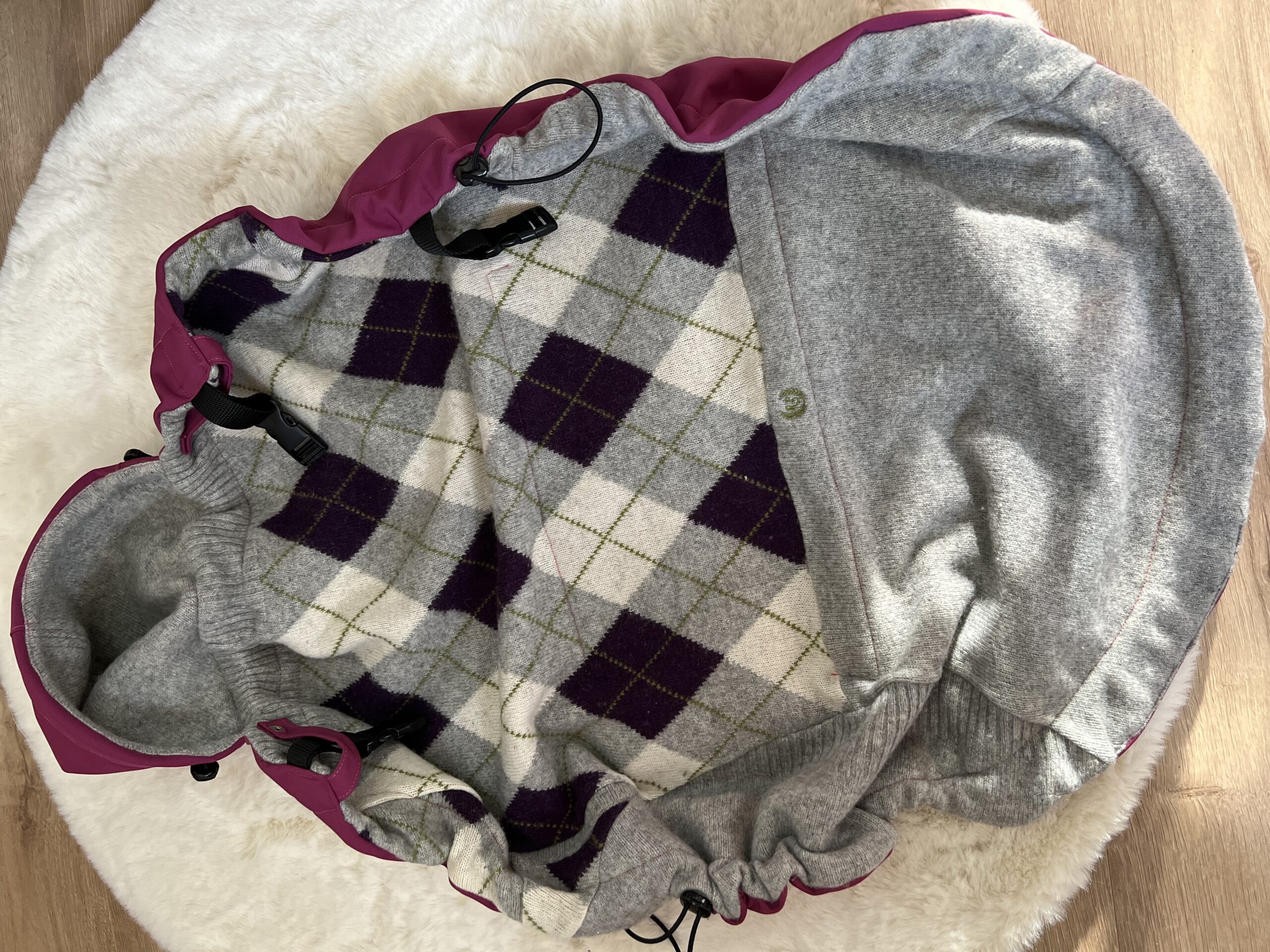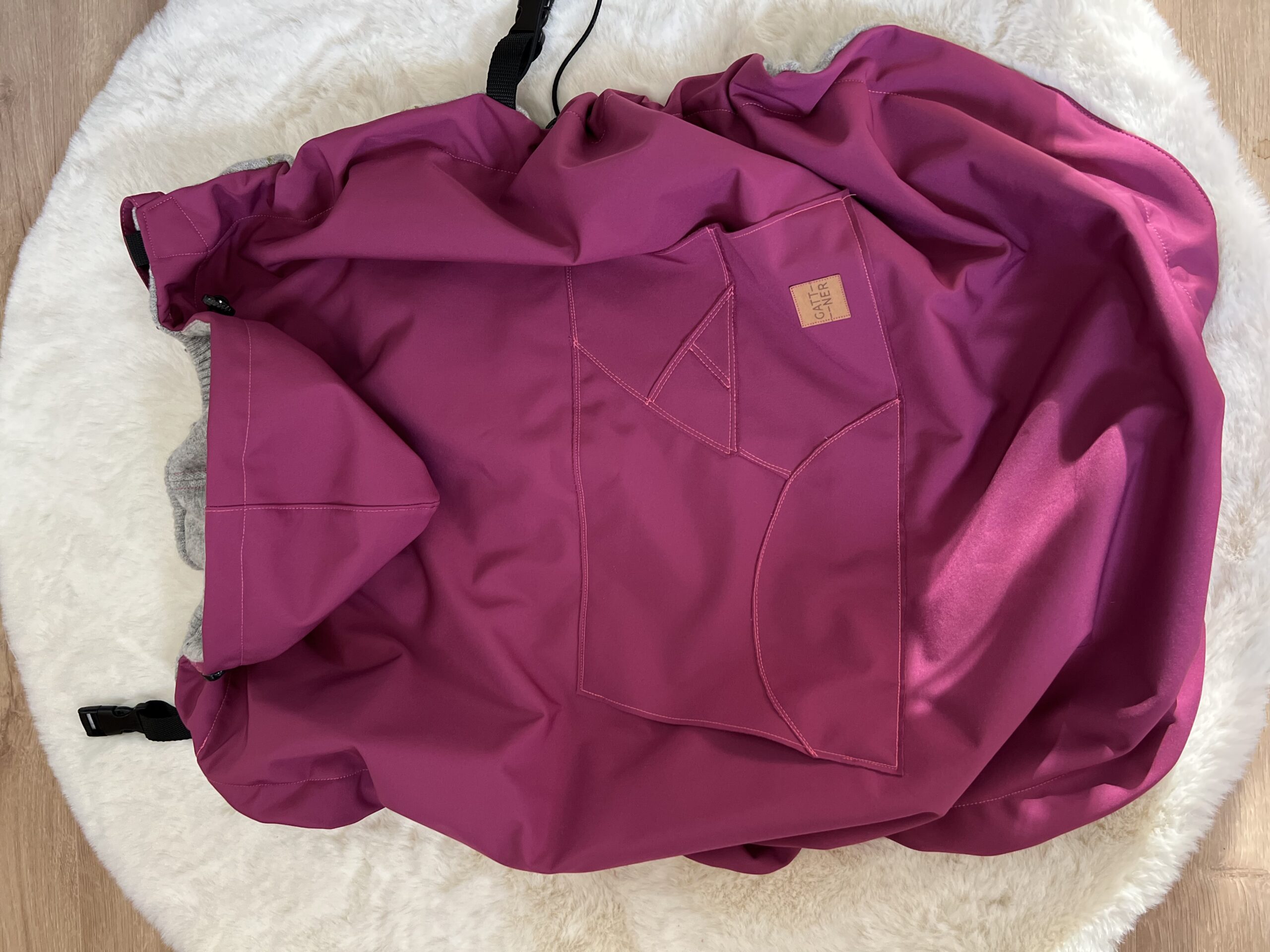 Osłonkę wykonałam z wysokogatunkowego softshellu (softshell posiada trzy warstwy: elastyczna tkanina poliestrowa, membrana, krótko strzyżony polar).